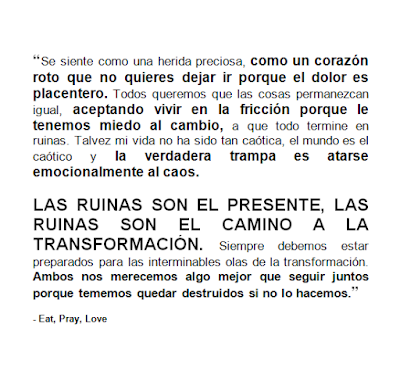 Había tenido en una relación amorosa destructiva durante 2 años y 1 mes y unos cuantos días. Una relación que no era lo que yo deseaba para mi futuro, pero que me mantenía en mi zona de confort y me hacía sentir segura mientras evitaba enfrentarme a estar sola conmigo misma.