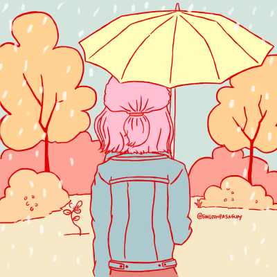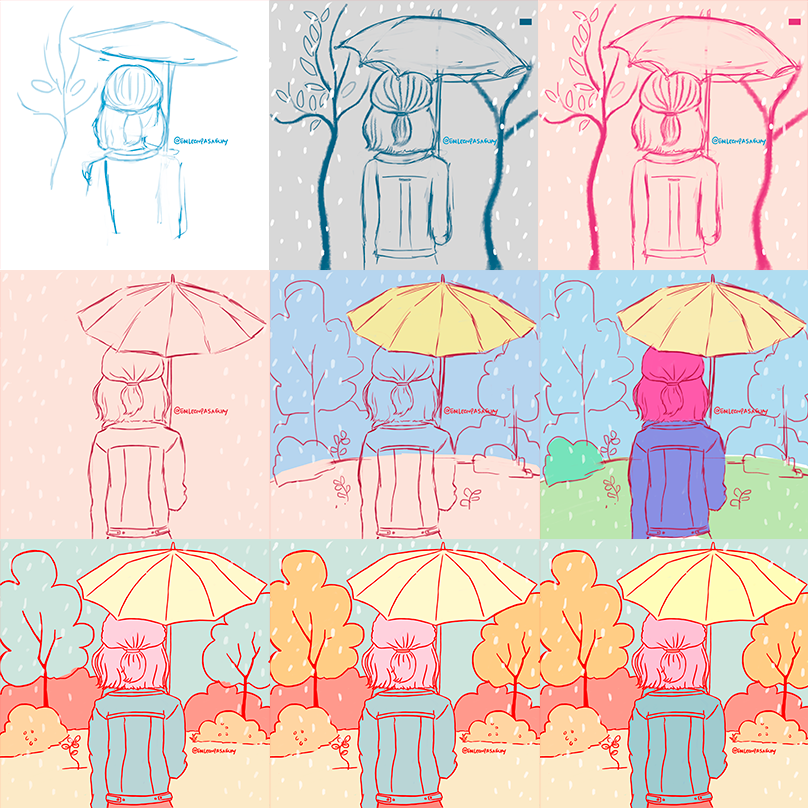 En esta ocasión estuve trabajando en una ilustración sobre la lluvia (era obvio, lo sé) y practicando el desarrollo de fondos. Normalmente no le pongo fondos a mis ilustraciones porque «no me salen bien,» y por eso decidí practicarlos.