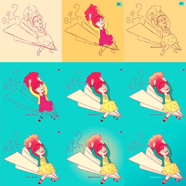 En las imágenes 6 y 7 coloqué sombras en el cabello, piel y vestido. Luego en la 8 estuve dudando sobre el fondo, lo veía plano y aburrido e intenté colocarle otro color, pero definitivamente el amarillo no quedaba bien.