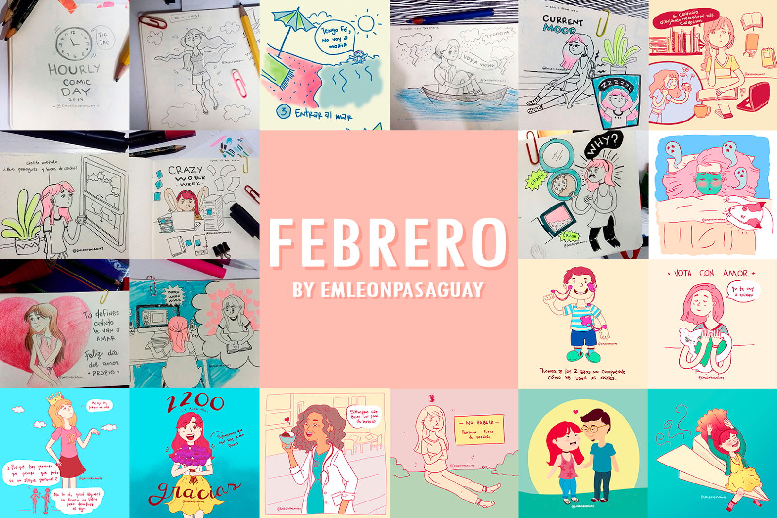 Este es el collage con las ilustraciones del mes de Febrero. A pesar de que este mes pasé menos tiempo dibujando en el computador conseguí realizar más piezas que en Enero.