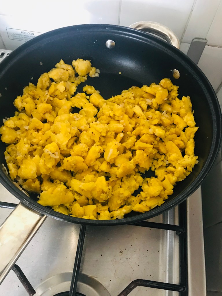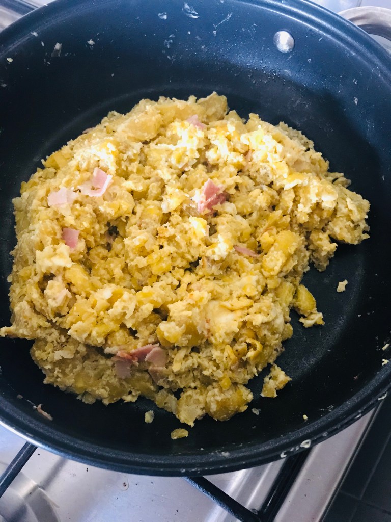 *Añadí leche a la preparación del tigrillo aunque en ninguna de las recetas lo mencionen para que no estuviera tan seco el verde (plátano), y usamos tocino en lugar de chicharrón de chancho porque era lo que teníamos.